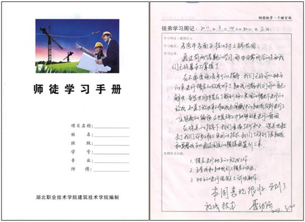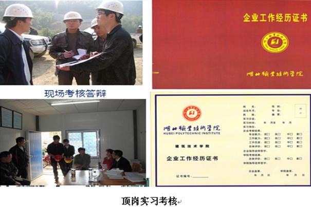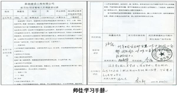 通过与大型建筑企业深度合作,采取先招生后招工的形式,学生和企业在双向选择的基础上,学生入校时学生、学校、企业签订实习就业协议,明确学生、学校、企业三方的目标和责任,顶岗实习前校企共同制定《学徒顶岗实习手册》,明确顶岗轮岗岗位——施工员和安全员,明确带徒的师傅人选和工作职责,并要求师徒签订协议书。顶岗实习中建立了校企定期沟通协调机制,对师徒实行双重管理。学徒须认真学习并填写《师徒学习手册》,至少完成20篇顶岗实习周记,每篇实习周记300字以上,实习周记须有企业师傅的签字,每学期学生还要撰写2000字以上的实习总结报告并答辩,由校企双方共同对学生实习情况进行答辩考核。顶岗合格及以上的学生由学校和企业一起颁发“企业工作经历证书”,并由合作单位录用;顶岗不合格的学生责成重修,不能被合作单位录用。该实训环节主要集中于第5-6学期。