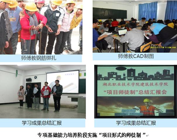 该实训环节主要在校内实训基地,部分也可以直接到师傅所在的建筑工地实施,由能工巧匠当师傅,采用“技能项目式,项目师徒制,师徒双向选择”形式进行,即由企业的能工巧匠开出技能项目,如建筑识图、CAD制图、建筑测量放线、工种实训、材料进场检测与验收等,学生根据开出的项目书面申请选择师傅,师傅根据学生的申请以每6-18人为一班,以口传身授为主要教学形式,利用每天2-4学时的时间进行为期5-10周的边干边学,逐一培养学生的专项基础能力,学生在专项技能基础训练阶段至少3项技能合格才能进入综合实务技能训练阶段。该实训环节主要集中于第1-2学期。