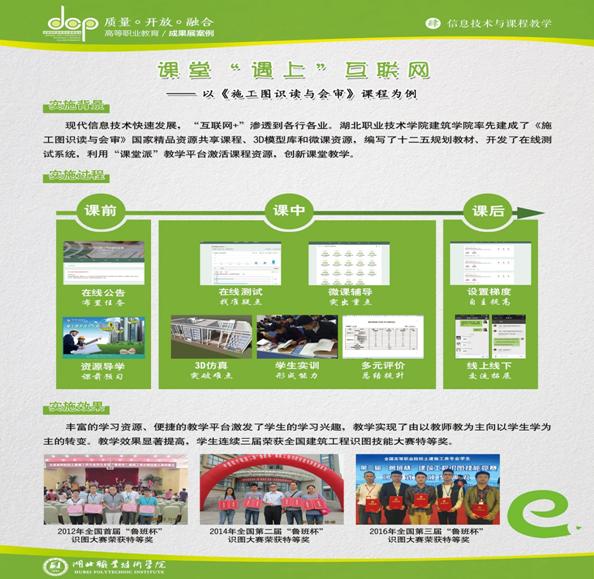 “课堂‘遇上’互联网,以‘《施工图识读与会审课程》’为例”案例参选2016年全国高职高专校长联席会成果展,信息技术与课堂教学融合效果明显。