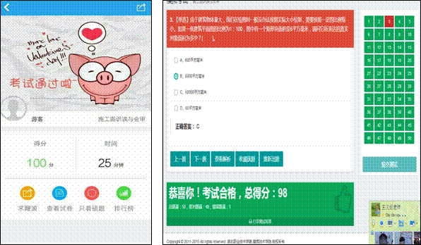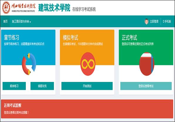 完成专业课程试题库,推行考教分离制度,开发建成《施工图识读与会审》、《建筑施工技术》、《建筑材料》、《建筑工程成本控制与管理》、《建筑构造》、《建筑法规》6门课程网络在线学习测试系统和手机APP软件。开发建成《建设工程管理专业水平综合测试》、《工程造价专业水平综合测试》、《建筑工程技术专业水平综合测试》、《道路与桥梁工程技术专业水平综合测试》、《楼宇智能化专业水平综合测试》5个专业水平在线学习测试系统。在线测试系统可随机组题、随时测试、随时巩固,强化学生掌握专业知识。