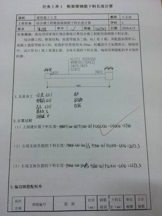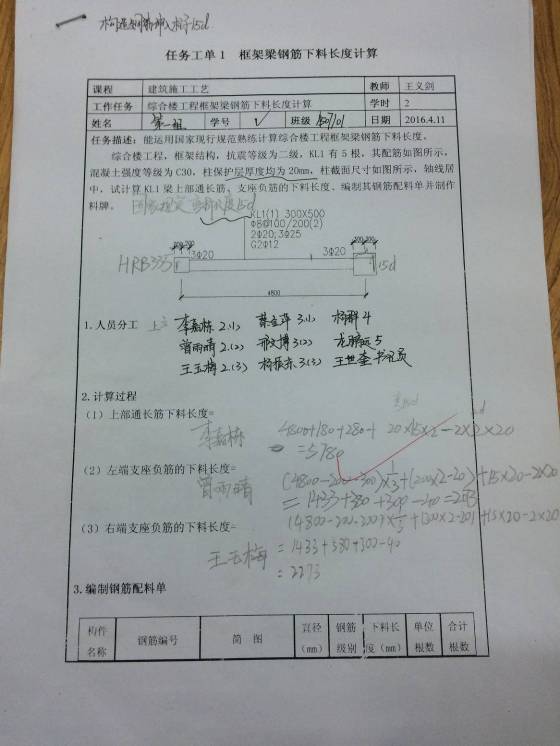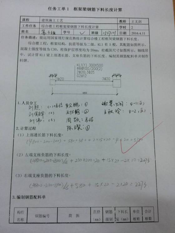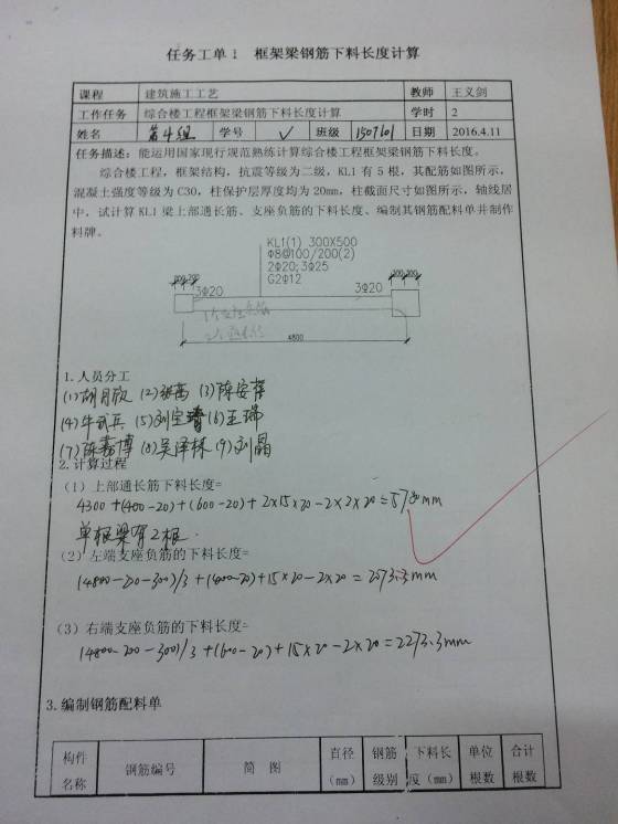 一、项目名称:综合楼工程框架梁钢筋下料长度计算 二、实施时间:4月11日(周一)第5-6节课,4月12日(周二)第3-4节课 三、实施地点:107、108教室 四、实施班级:1507101、1507102班 五、教学内容: 1.钢筋下料计算的依据; 2.钢筋弯曲的量度差值及弯钩增加值; 3.下料长度的计算; 4.钢筋配料单的制作; 5.料牌制作。 六、教学组织:班级共50人,每5人一组,实行组长负责制,组长负责任务分解、安排及实施,组长要保证小组每个成员能完成工作任务。 七、实施步骤: 1、发任务工单,布置任务 2、案例教学 3、小组讨论,完成任务 4、小组自评 5、小组互评 6、教师评价及总结
