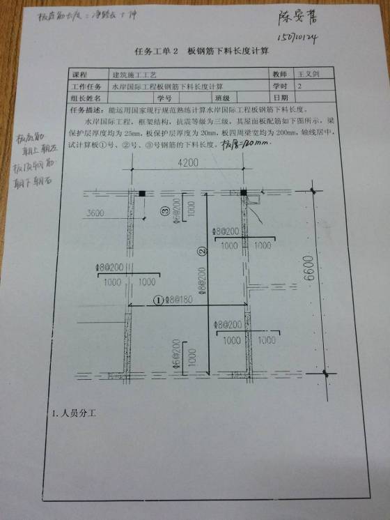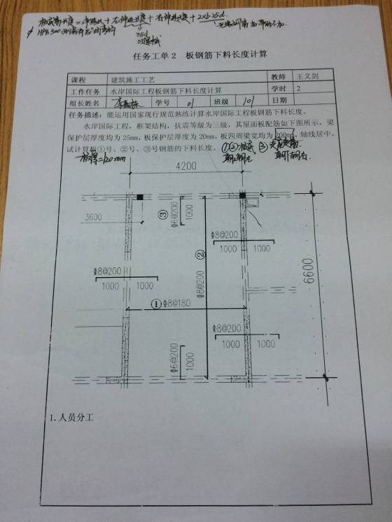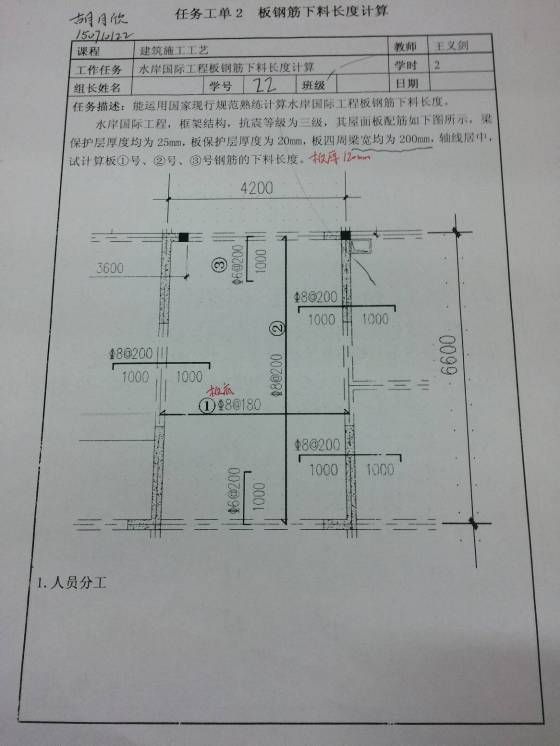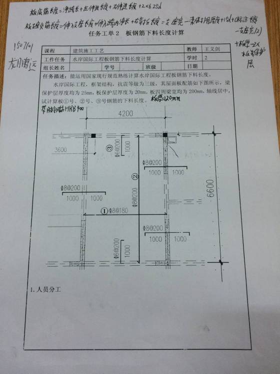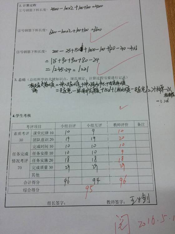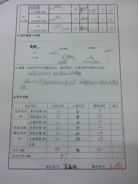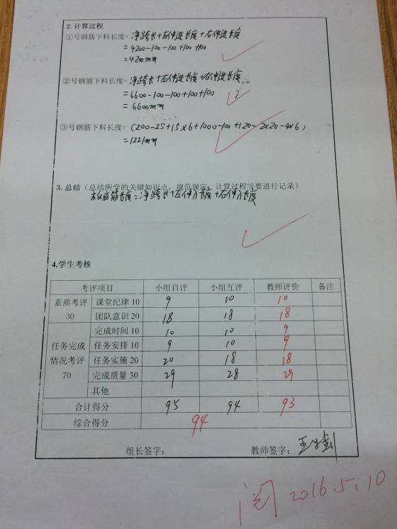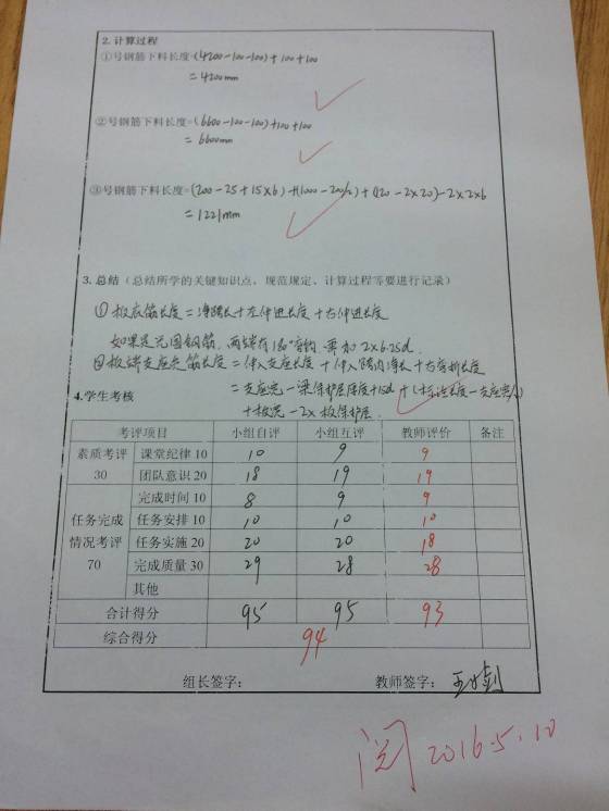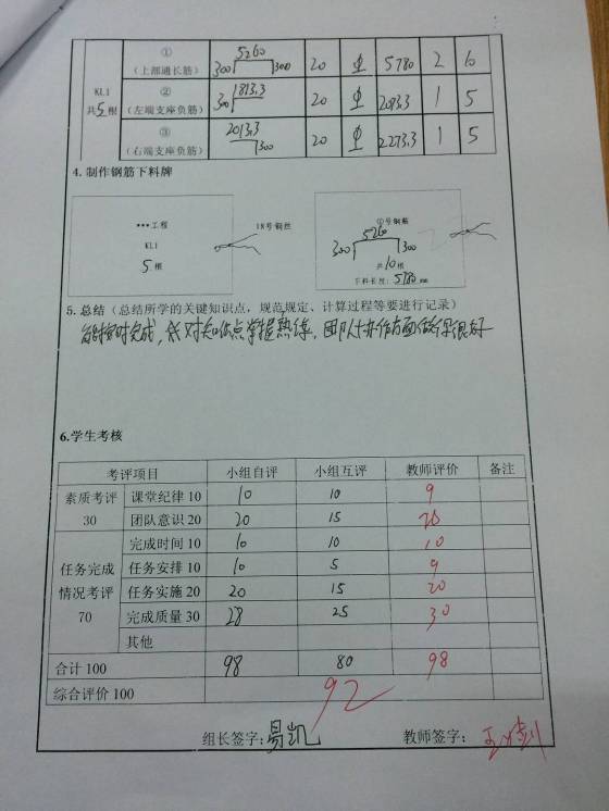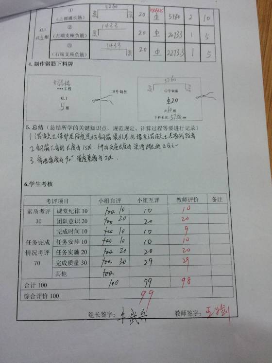 一、项目名称 :综合楼工程有梁楼盖板钢筋下料长度计算 二、实施时间:5月9日(周一)第5-6节课,5月10(周二)第3-4节课 三、实施地点:107、108教室 四、实施班级:1507101、1507102班 五、教学内容: 1.钢筋下料计算的依据; 2.钢筋弯曲的量度差值及弯钩增加值; 3.下料长度的计算; 4.钢筋配料单的制作; 5.料牌制作。 六、教学组织:班级共50人,每5人一组,实行组长负责制,组长负责任务分解、安排及实施,组长要保证小组每个成员能完成工作任务。 七、实施步骤: 1、发任务工单,布置任务 2、案例教学 3、小组讨论,完成任务 4、小组自评 5、小组互评 6、教师评价及总结