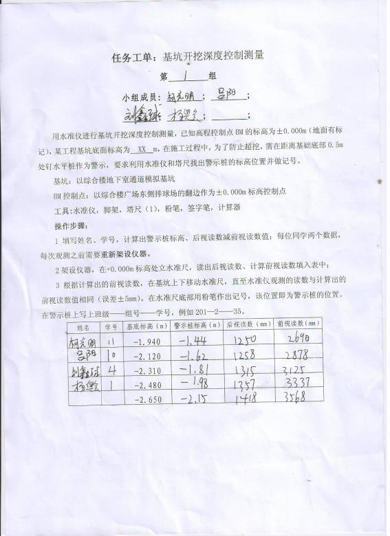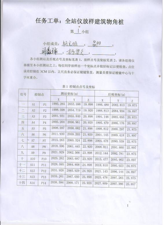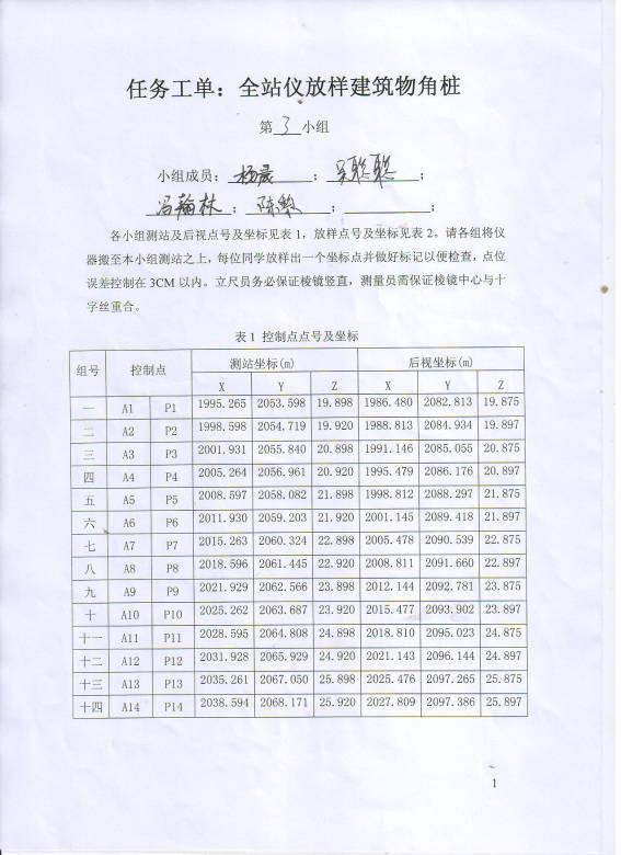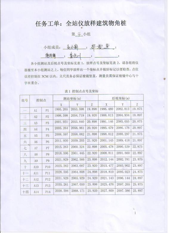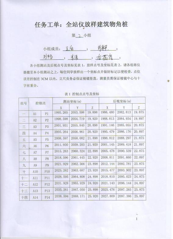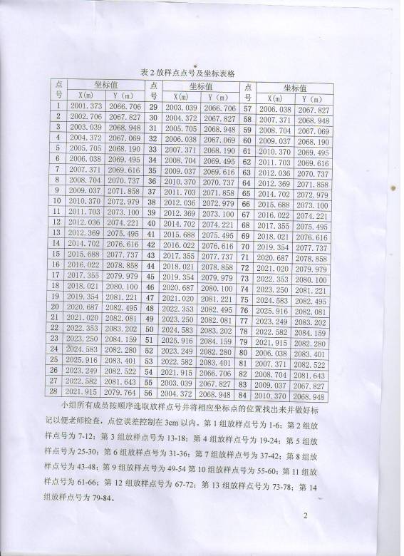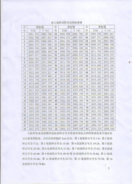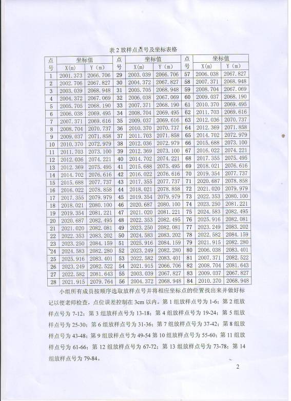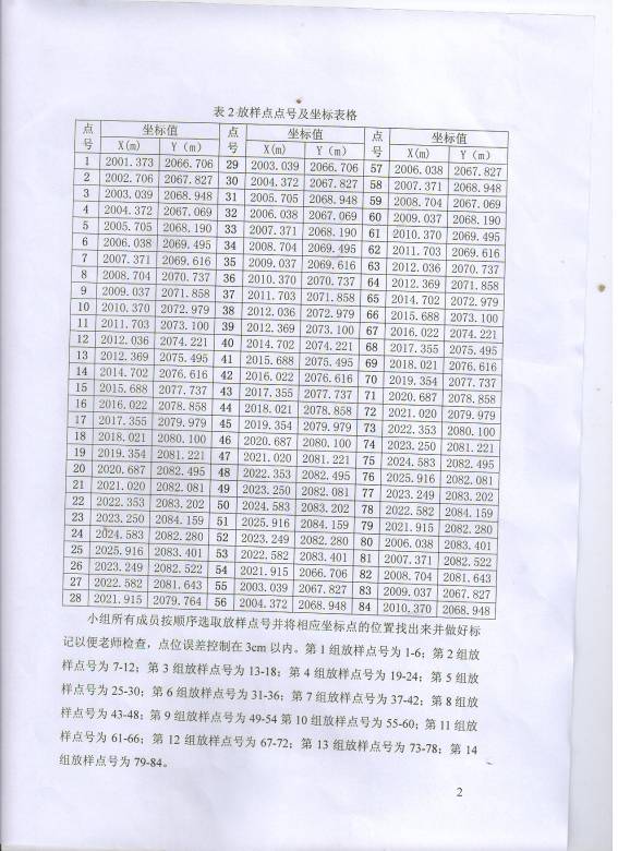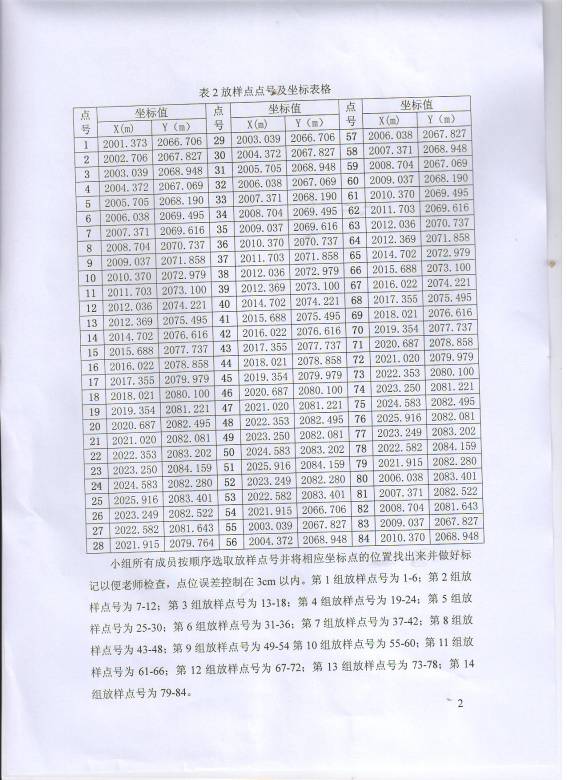 小组所有成员按顺序选取放样点号并将相应坐标点的位置找出来并做好标记以便老师检查,点位误差控制在3cm以内。第1组放样点号为1-6;第2组放样点号为7-12;第3组放样点号为13-18;第4组放样点号为19-24;第5组放样点号为25-30;第6组放样点号为31-36;第7组放样点号为37-42;第8组放样点号为43-48;第9组放样点号为49-54第10组放样点号为55-60;第11组放样点号为61-66;第12组放样点号为67-72;第13组放样点号为73-78;第14组放样点号为79-84。