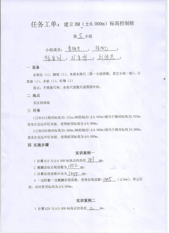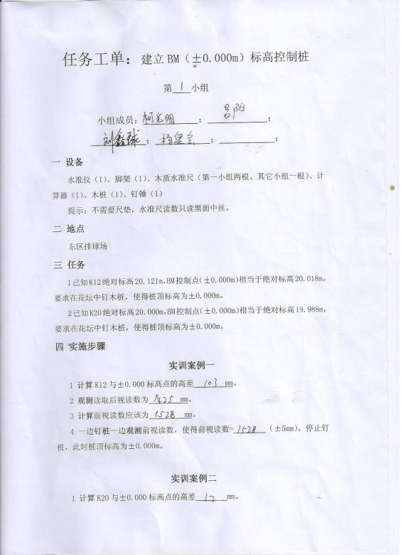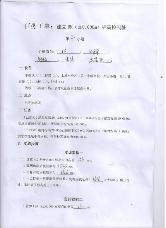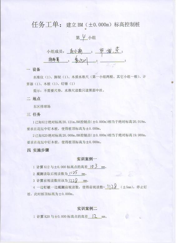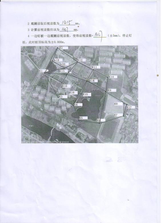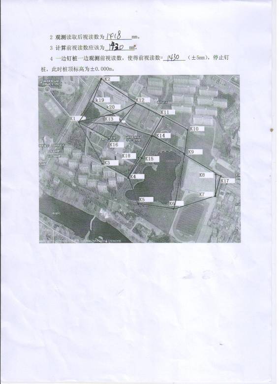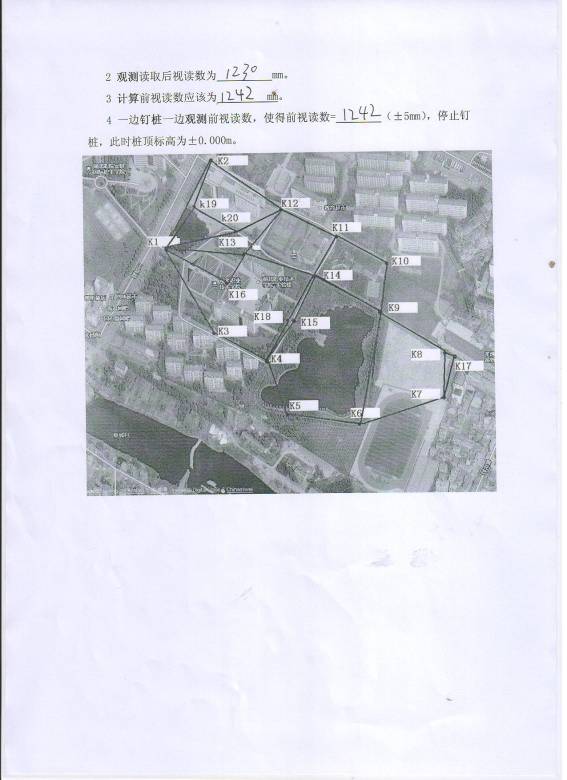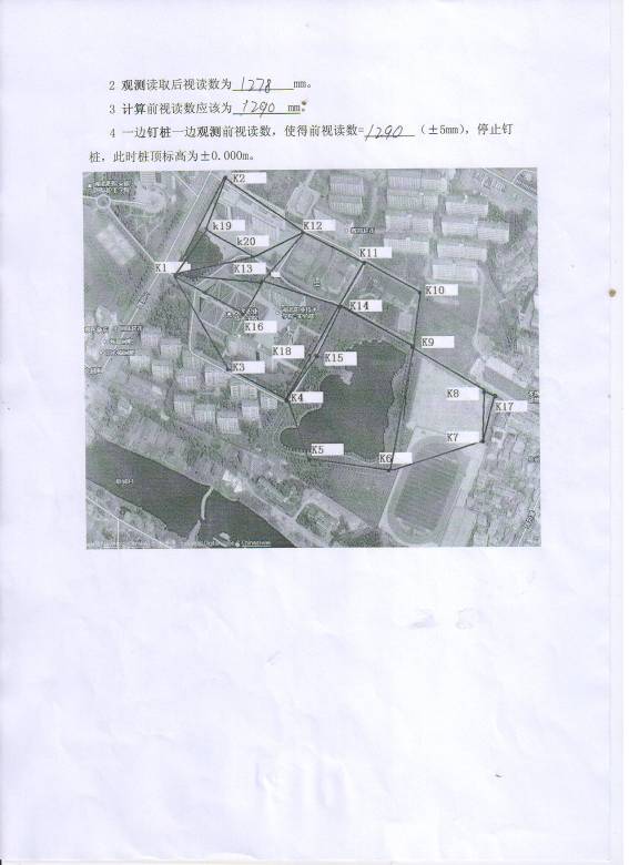 1已知K12绝对标高20.121m,BM控制点(±0.000m)相当于绝对标高20.018m,要求在花坛中钉木桩,使得桩顶标高为±0.000m。