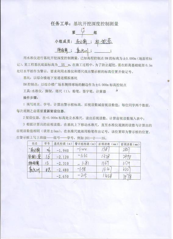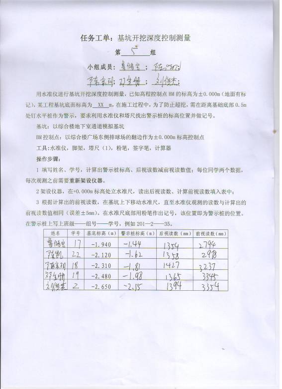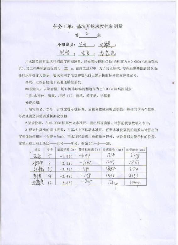 一、项目名称 :建立±0.000m标高控制桩 二、实施时间:3月17日(周四)第3-4节课 三、实施地点:测量控制点 四、实施班级:1507201 五、教学内容:学生能熟练操作水准仪、能正确进行水准尺读数、能计算两点的高差、能依照设计标高和高程控制点放样出±0.000m标高控制桩。 六、教学组织:班级共22人,分为5个教学小组(每4-5人一组),实行组长负责制,组长负责仪器的借还、任务的安排及实施,组长要保证小组每个成员能完成工作任务。 七、实施步骤: 1.讲解高差测量的原理和任务的操作流程 2.发任务工单,布置工作任务; 3.组织学生完成工作任务; 4.检查学生任务完成情况; 5.对学生进行考核。 八、考核方式:按照任务工单,对学生的劳动纪律、工单完成情况、学生实操结果等进行自我评估、组长评估、老师评估三个方面综合考核。