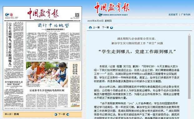 建筑技术学院与泰森建设集团成立了联合党支部,创新了校企合作双方党员师生的教育管理服务模式,探索出一条高职院校党建工作的新路径。受到了上级党委的高度重视和关注,《中国教育报》、《湖北日报》、荆楚网、腾讯大楚网、湖北电视台、孝感电视台等媒体分别从不同角度进行了宣传报道。校企共建联合党支部有力推进了学校党建工作,为新时期做好高职院校党建工作进行了积极探索。