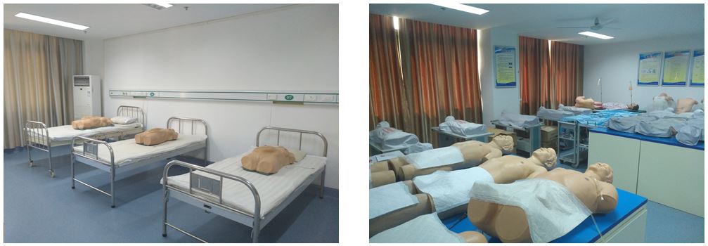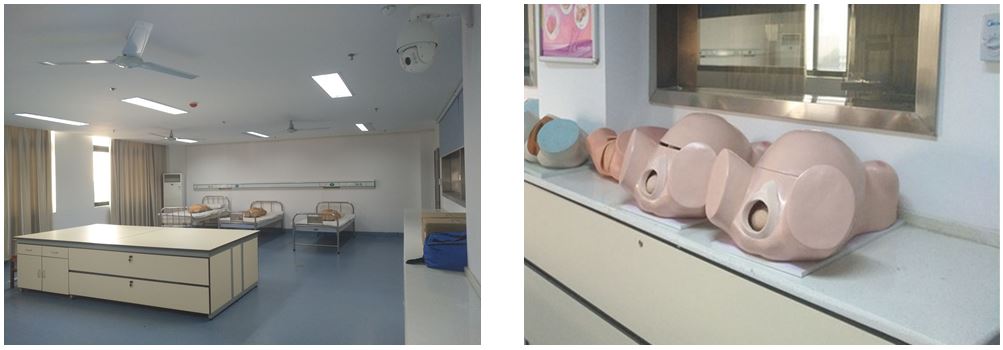 妇产科技能实训室主要包括:妇产科基本技能实训室、模拟产房,主要仪器设备有妇科检查模拟人、产科模拟人、高级四步触诊模型、会阴切开缝合模型、分娩机制模型、产床、非接触式洗手设备和常用手术器械等,能够满足妇产科基本技能操作和平产接生实训教学需要。