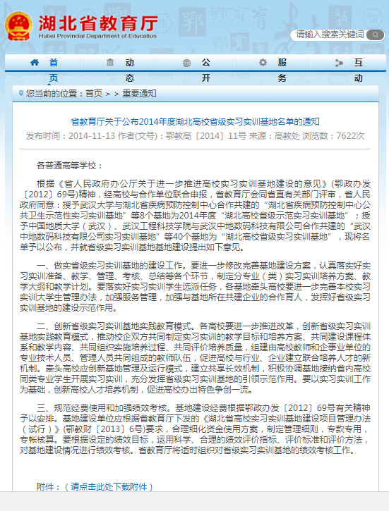 省教育厅关于公布2014年度湖北高校省级实习实训基地名单的通知