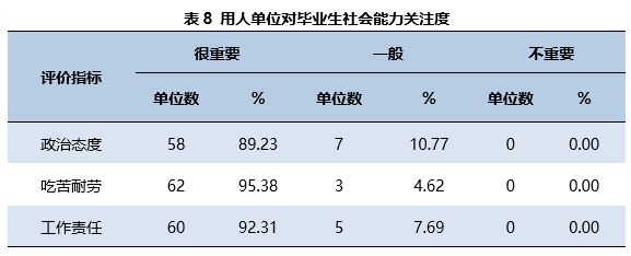 对毕业生的“发展能力”调查了解了“虚心学习,有钻研精神”、“具备专业技术方面的发展潜力”和“有独立思考问题手创新能力”三个方面,用人单位对上述三个问题的关注度都在90%以上,说明用人单位对毕业生可持续发展能力还是很重视的。