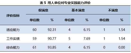 在对学生专业实践能力的评价中,用人单位对我校毕业生的岗位适应能力表现是满意的,但在工作实际业绩与效果和解决实际问题的综合专业能力2个方面评价略差。特别是解决实际问题的综合专业能力方面还有较大的提高空间。