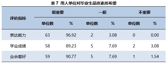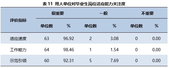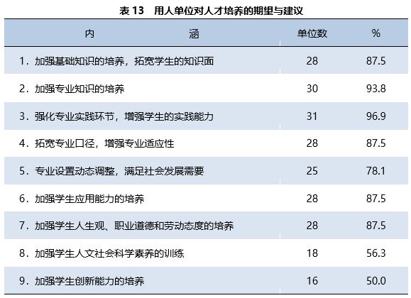 在调查中,很多用人单位对毕业生的专业综合应对能力和应变能力提出了更高层次的要求,期望毕业生能独挡一面开展工作,提高工作适应能力。
