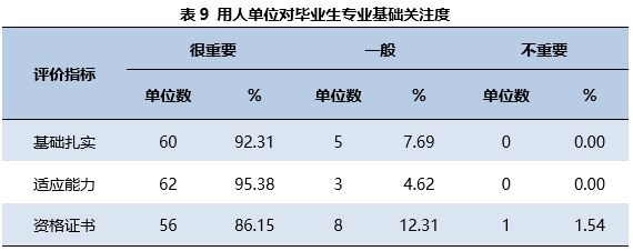 在毕业生的“专业基础”素质方面主要调查了“基础扎实”、“适应能力”和“资格证书”3个方面,用人单位主要看重专业“基础扎实”和岗位“适应能力”2个方面,而不太关注毕业生的职业 “资格证书”。