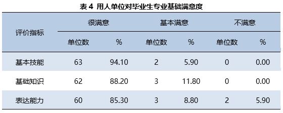 用人单位对我校毕业生关于专业基础方面的满意调查中,对我校毕业生的基本技能和基础知识总体满意,但在语言或书面表达能力方面基本满意、不满意率相对较大。
