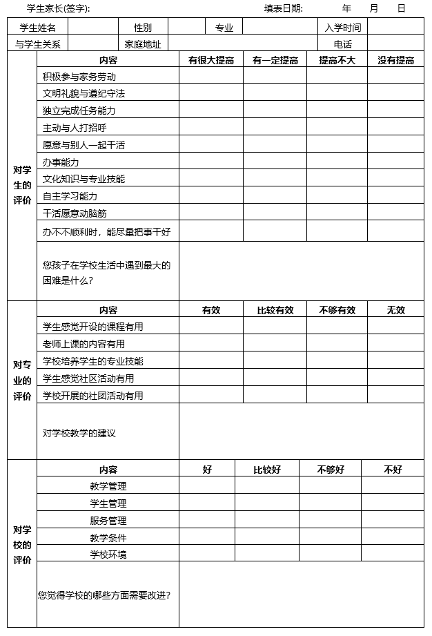 请学生家长从学校办学条件、人才培养方式、学生管理、学生成长等方面进行综合评价。
