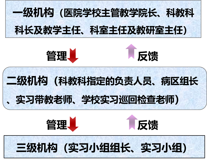 “三级管理”:即学生临床实习实施学校、院系、专业三级管理。“三师指导”,即学校配备学生临床实习的专业导师和生活导师,实习单位选派带教老师。专业导师由专业骨干教师担任,直接(进医院)或间接(远程)对实习学生进行专业知识与技能指导;生活导师由学校辅导员或班主任担任,主要负责临床实习学生操行管理和生活方面的问题处理;带教老师由医院骨干医师担任,主要负责实习学生的实习操作指导和职业素养提高。