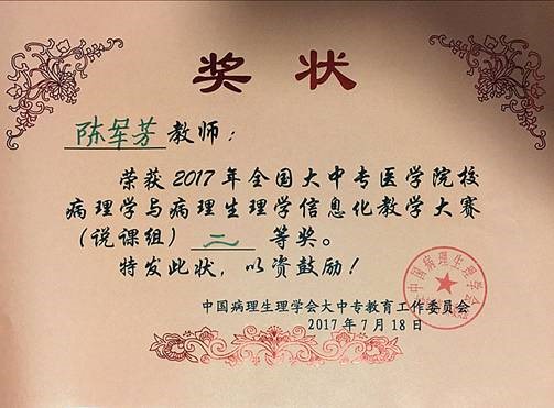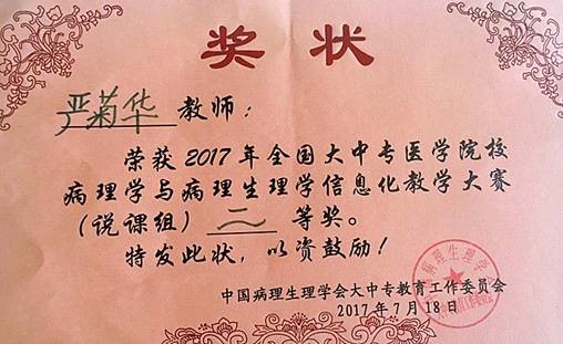 陈军芳、严菊华老师获得全国大中专医学院校病理学与病理生理学信息化教学大赛