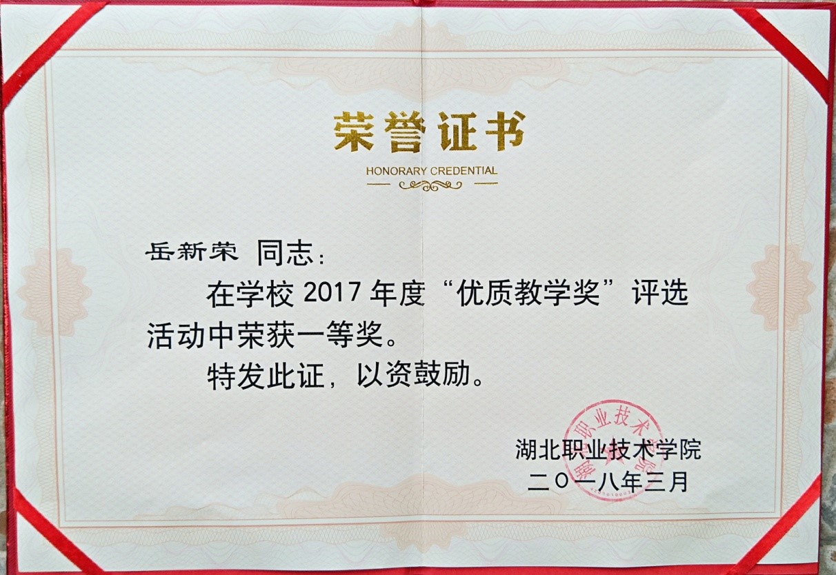 岳新荣老师获得湖北职业技术学院2017年度“优质教学奖”一等奖