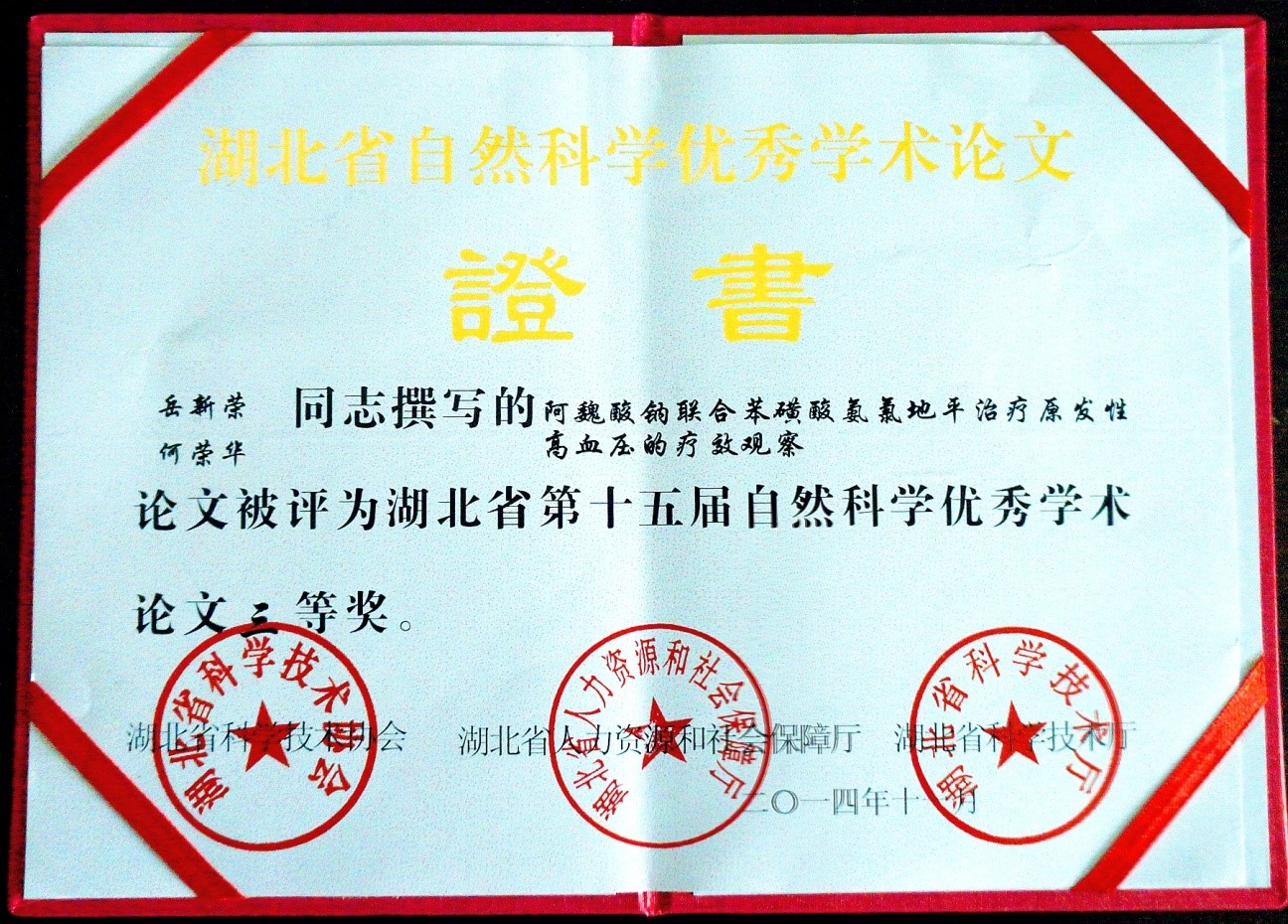 岳新荣老师的论文获得湖北省第十五届自然科学优秀学术论文三等奖