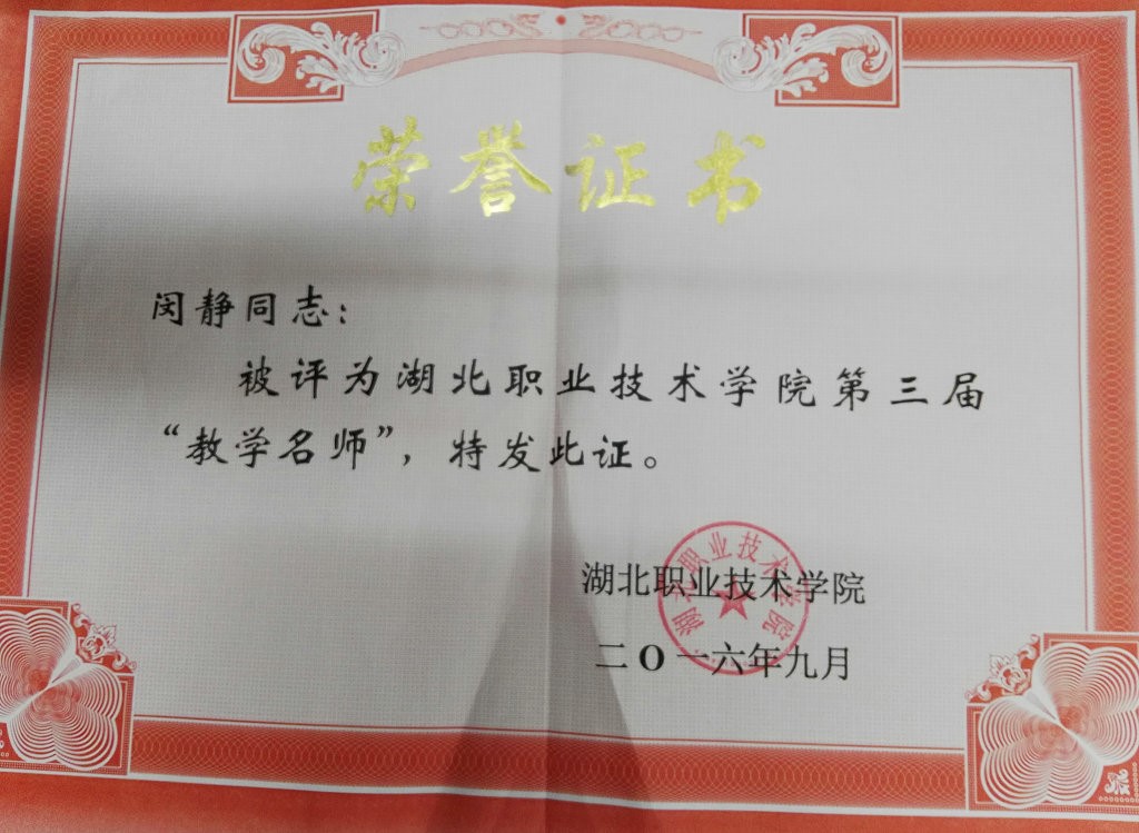 闵静老师被评为湖北职业技术学院第三届“教学名师”