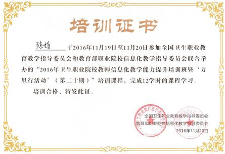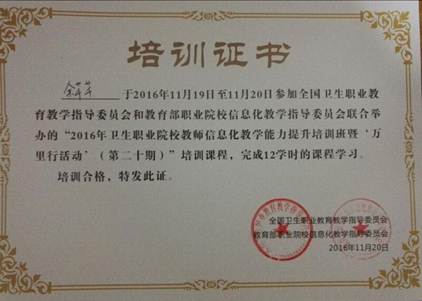 陈娟参加卫生职业院校教师信息化教学能力提升培训班证书