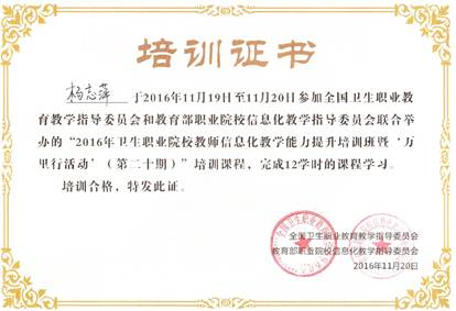 杨志萍参加卫生职业院校教师信息化教学能力提升培训班证书
