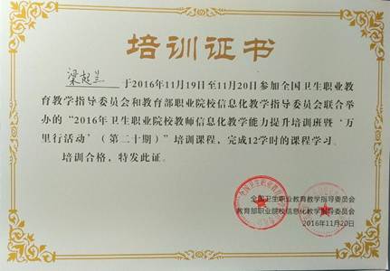 梁超兰参加卫生职业院校教师信息化教学能力提升培训班证书