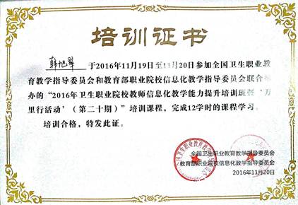 韩旭翠参加卫生职业院校教师信息化教学能力提升培训班证书