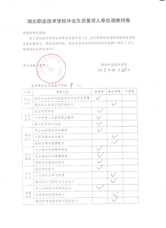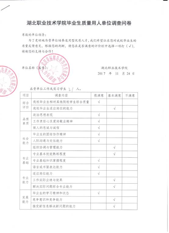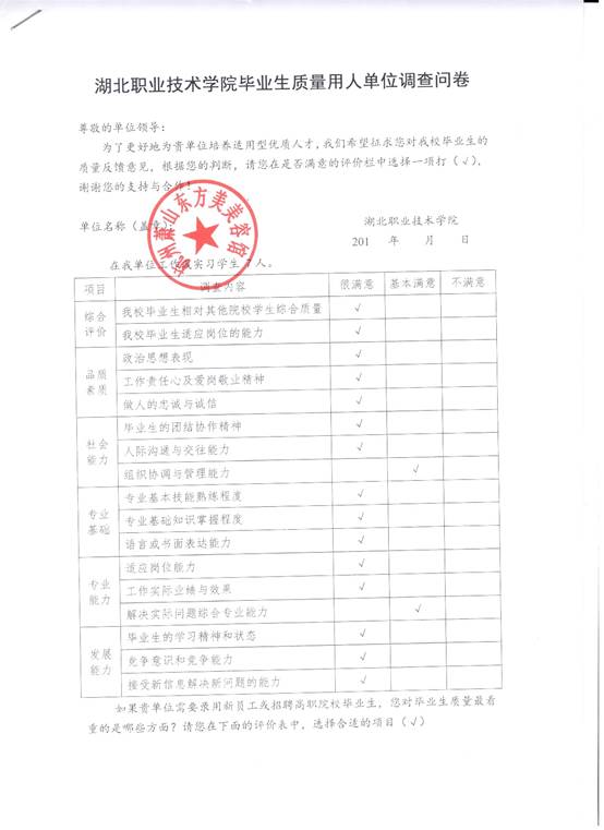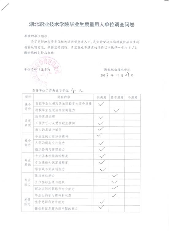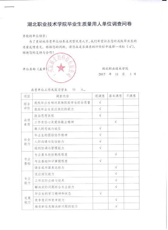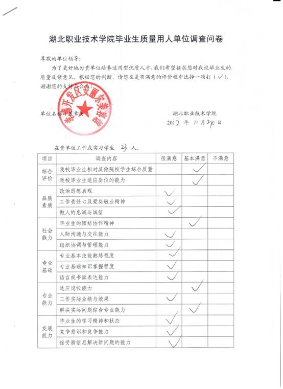 对部分用人单位进行抽样调查,了解用人单位对学生品质素质、社会能力、专业基础、专业能力、发展能力等方面的满意度,了解用人单位的实际人才需求,促进专业教学改革和专业教学持续改进,不断提高专业人才培养质量。