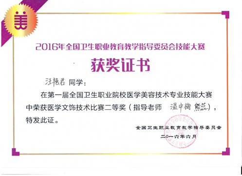 汪艳君同学在第一届全国卫生职业院校医学美容专业技能大赛中荣获二等奖