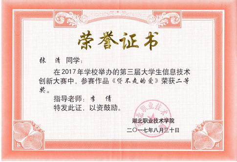 张清同学在2017年学校第三届大学生信息技术创新大赛中荣获二等奖