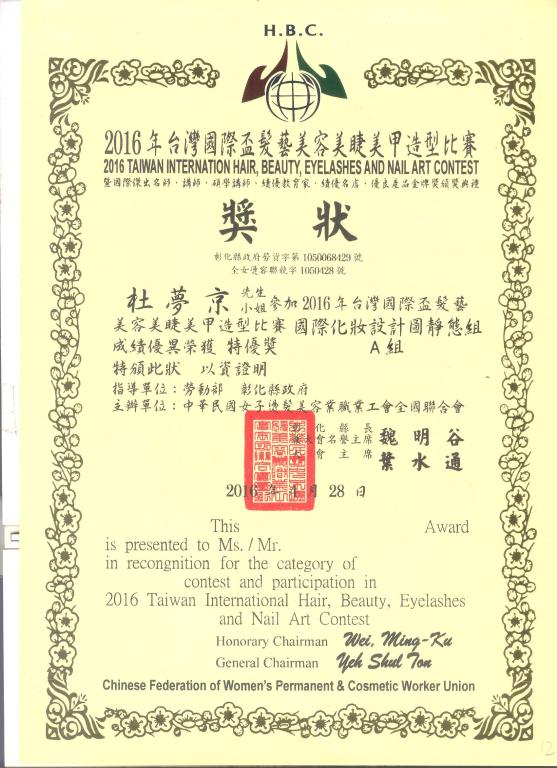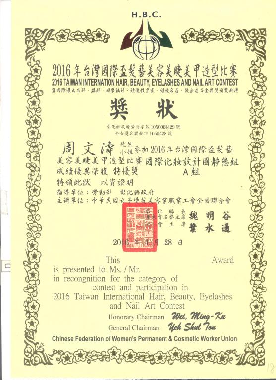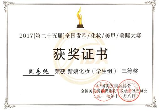 周易纯同学在第二十五届全国发型化妆美甲美睫大赛中荣获三等奖