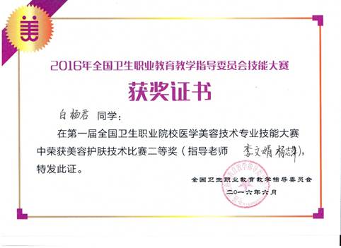 白杨君同学在第一届全国卫生职业院校医学美容专业技能大赛中荣获二等奖