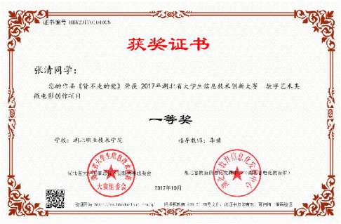 张清同学在2017年湖北省大学生信息技术创新大赛中荣获一等奖