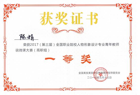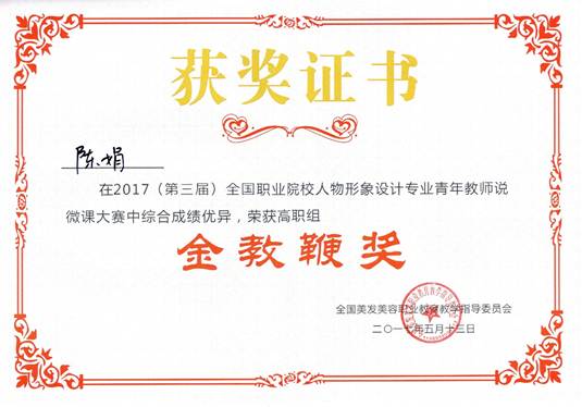 陈娟老师荣获第三届全国职业院校人物形象设计专业青年教师说微课大赛一等奖
