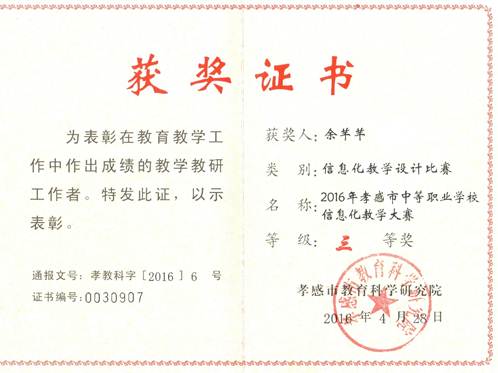 余芊芊在孝感市中等职业学校信息化教学大赛中荣获三等奖