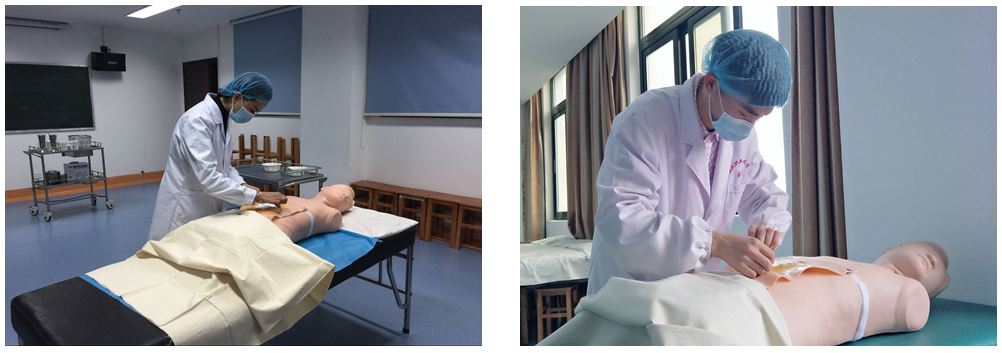 (一)手术人员无菌准备:开展手术洗手法、穿灭菌手术衣法、戴灭菌手套法的实训。并通过模拟手术室实训活动,了解手术室相关管理规则,树立无菌观念,培养协作精神。