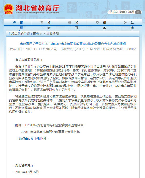 省教育厅关于公布湖北省高等职业教育实训基地及重点专业名单的通知