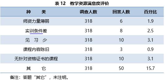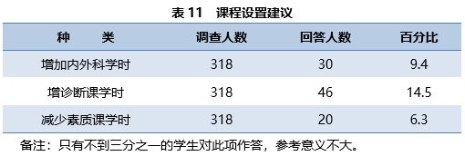 在课程设置方面,部分同学认为应该增加内科学、外科学的课数;适应减少思想政治课的教学内容。对课程资源的评价方面,参与答题的学生人数偏少,答题的同学认为学校的整体教学资源能满足教学要求,但应增加临床见习学时和执业资格证书课程的开设。因学生人数少,参考意义不大。