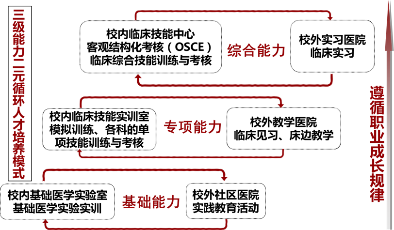 “三级能力”是指临床医学专业学生必须掌握的基础能力、专项能力和综合能力。在能力培养过程中,融入了职业素质和执业助理医师资格的要求,注重学生职业能力从基础能力到综合能力培养的成长规律,符合医学人才培养的特点。