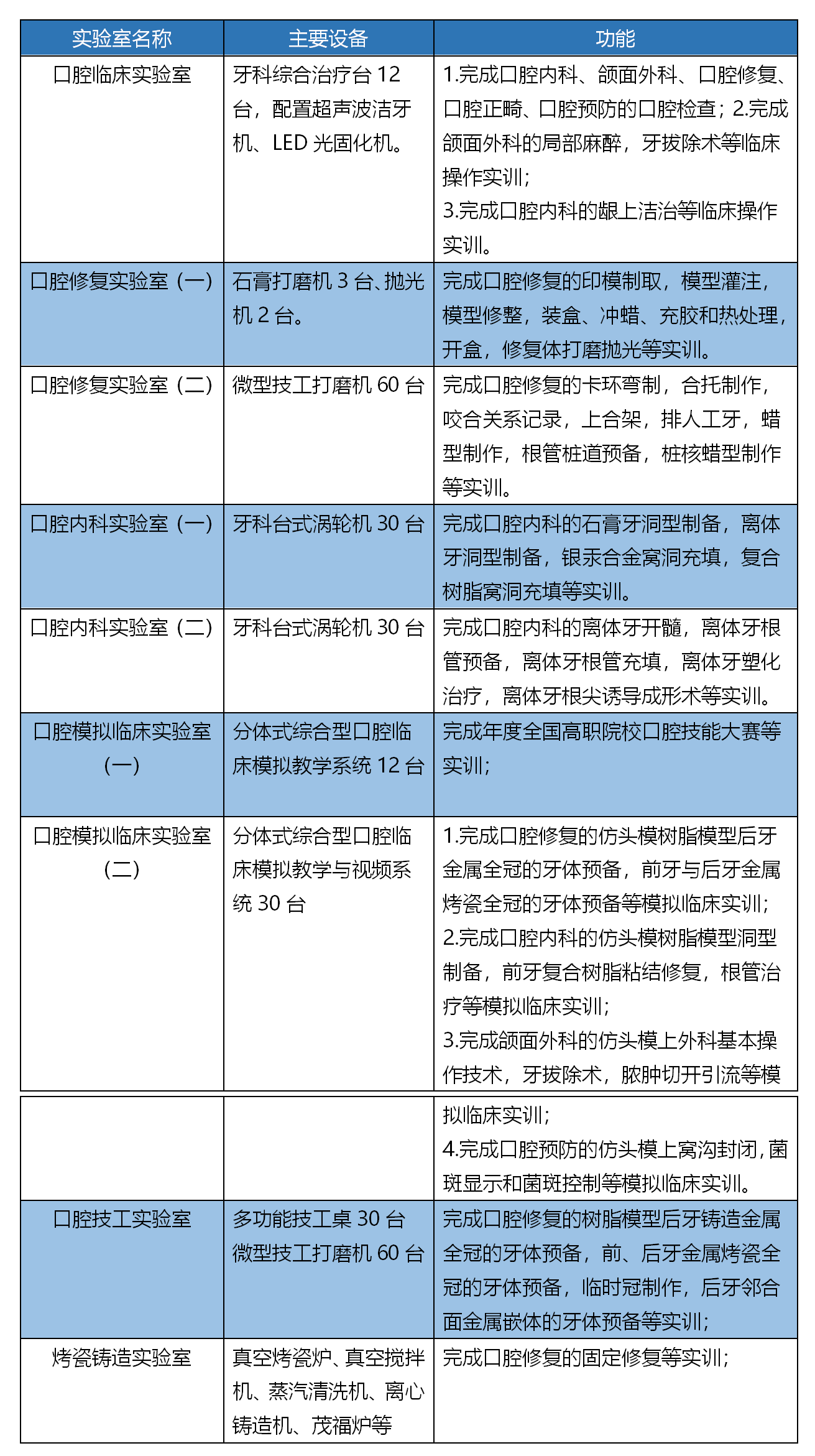 口腔医学院校内实训基地位于学校医学类专业实训中心(面积20000m2)内,经过连续数年建设,目前已建成1个口腔临床实验室、2个口腔修复实验室、2个口腔内科实验室、2个口腔模拟临床实验室、1个口腔技工实验室、1个烤瓷铸造实验室等9个专业实验室。实训基地总面积1500m2,有口腔综合治疗台、分体式综合型口腔临床模拟教学系统、牙科台式涡轮机等大型设备百余台,仪器设备总值近600万元。