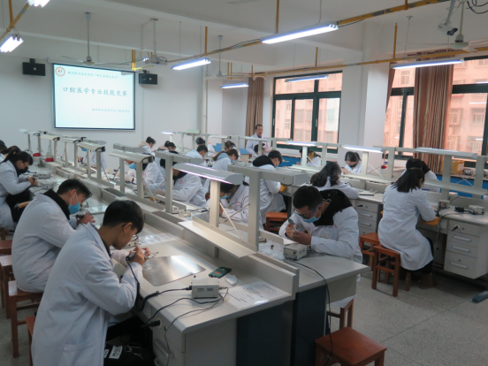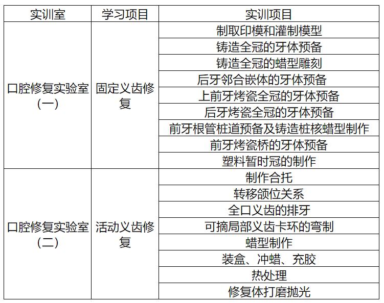 口腔修复实验室有实验室2间,现有石膏打磨机、抛光机、模型、微型技工打磨机、多媒体教学系统等教学设备,可以开展口腔修复科的:印模制取,模型灌注,模型修整,装盒、冲蜡、充胶和热处理、开盒,修复体打磨抛光,卡环弯制,合托制作,咬合关系记录,上合架,排人工牙,蜡型制作,根管桩道预备,桩核蜡型制作、牙体预备等校内实验实训项目,能满足教学与实验实训需要。