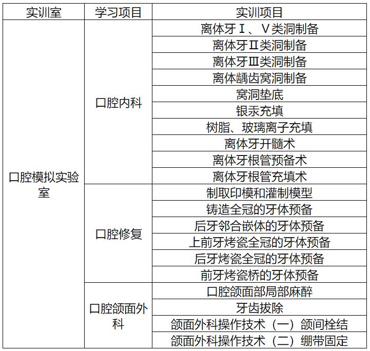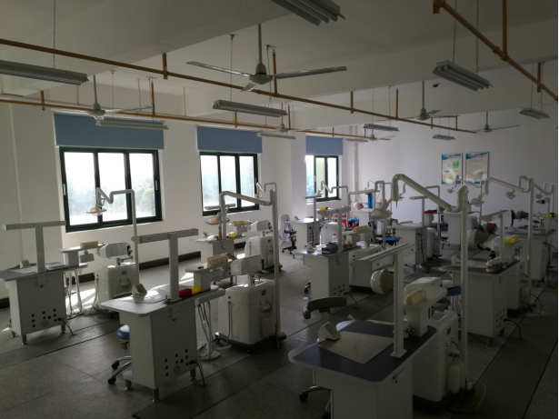 口腔模拟实验室有实验室2间,现有分体式综合型口腔临床模拟教学与视频系统50台、多媒体教学系统等教学设备。可以开展仿头模树脂模型后牙金属全冠牙体预备、前后牙全瓷冠的牙体预备、仿头模树脂模型洞型制备、前牙复合树脂粘结修复、根管治疗、仿头模外科基本操作技术、牙拔除术、脓肿切开引流术、仿头模窝沟封闭等模拟临床实验实训项目,能满足教学与实验实训需要。