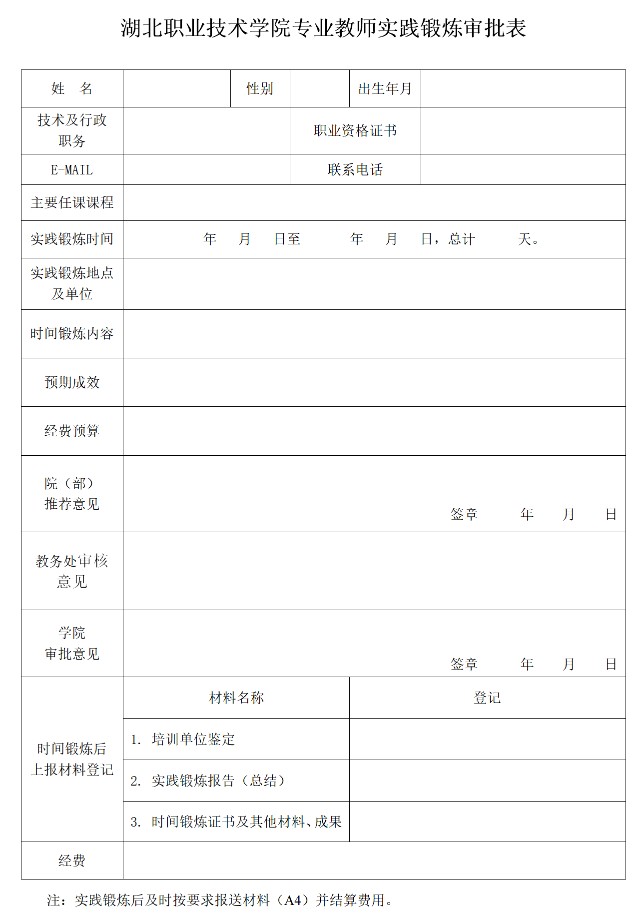 附件:湖北职业技术学院专业教师实践锻炼审批表