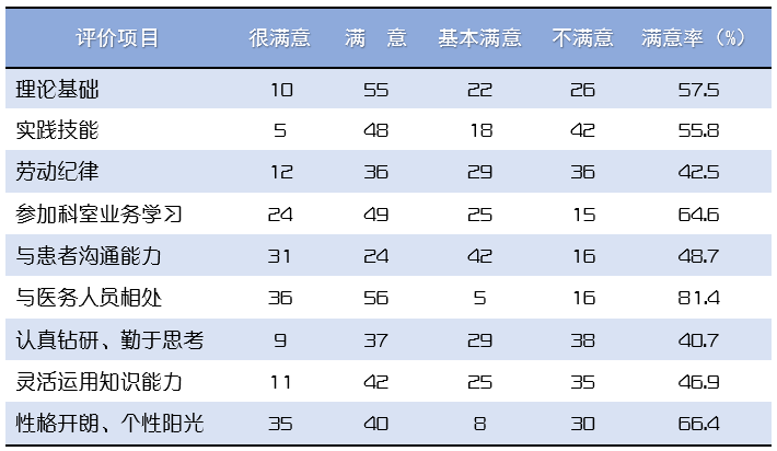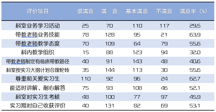 ①分析表2、表3,可以看出,实习生对临床实习各项结果满意率较低,反映出实习实践效果不佳;同时,带教老师对实习学生实习综合情况满意率也不高,表明实习生专业知识、专业技能、学习能力等综合素质有待进一步提高。师生互相满意率均不高,就体现出学生实习阶段陷入了困境,如不找出原因,及时化解,将严重影响人才培养质量和学校办学声誉。