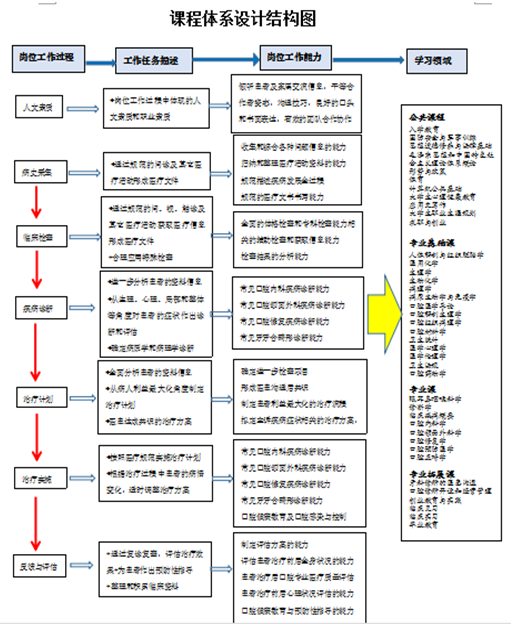 3、口腔助理医师职业岗位能力、知识和素质调研 通过同口腔科室负责人、专业技术骨干以及在近5年就业本校口腔医学专业毕业生座谈交流,摸清了用人单位对毕业生能力、知识、素质等方面的要求,明确了毕业生主要面向是口腔助理医师职业岗位,并对职业岗位主要工作任务及职业能力进行了剖析。同时参考历年来国家口腔助理执业医师考纲内容,总结出满足职业岗位应需求的学习模块、课程门类和课程内容(见图1)。