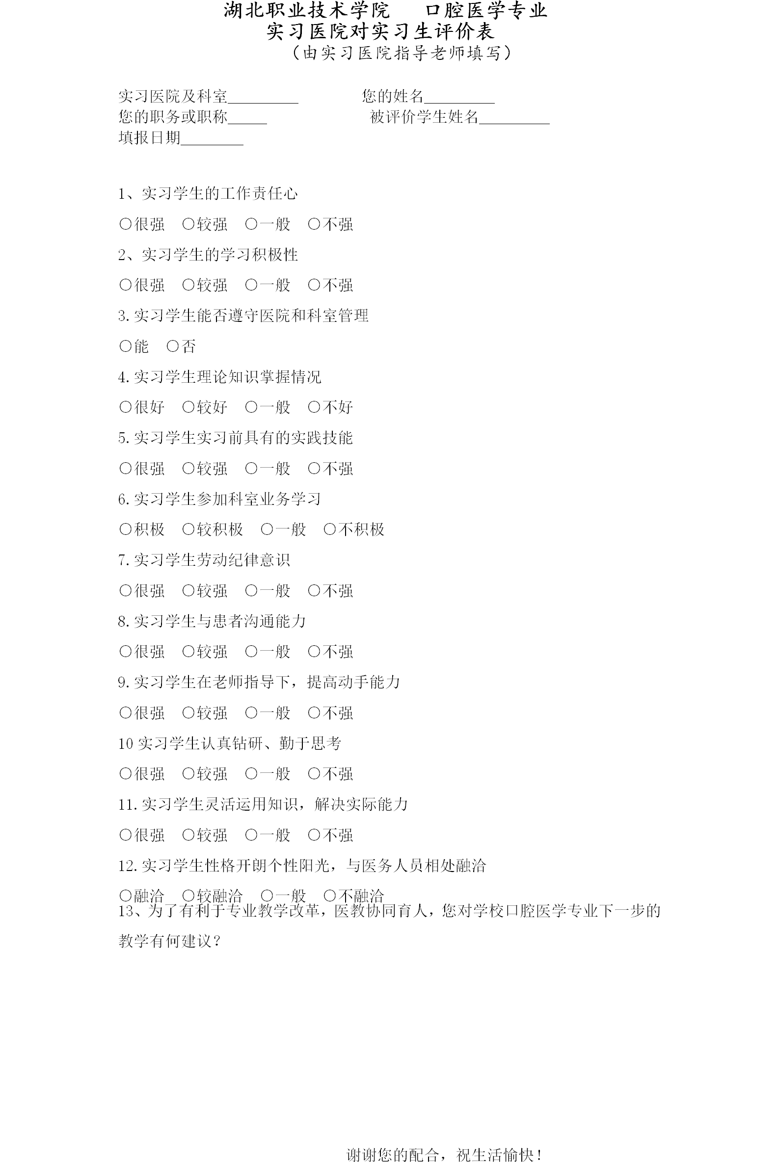 实习生评价调查表(实习医院填写)