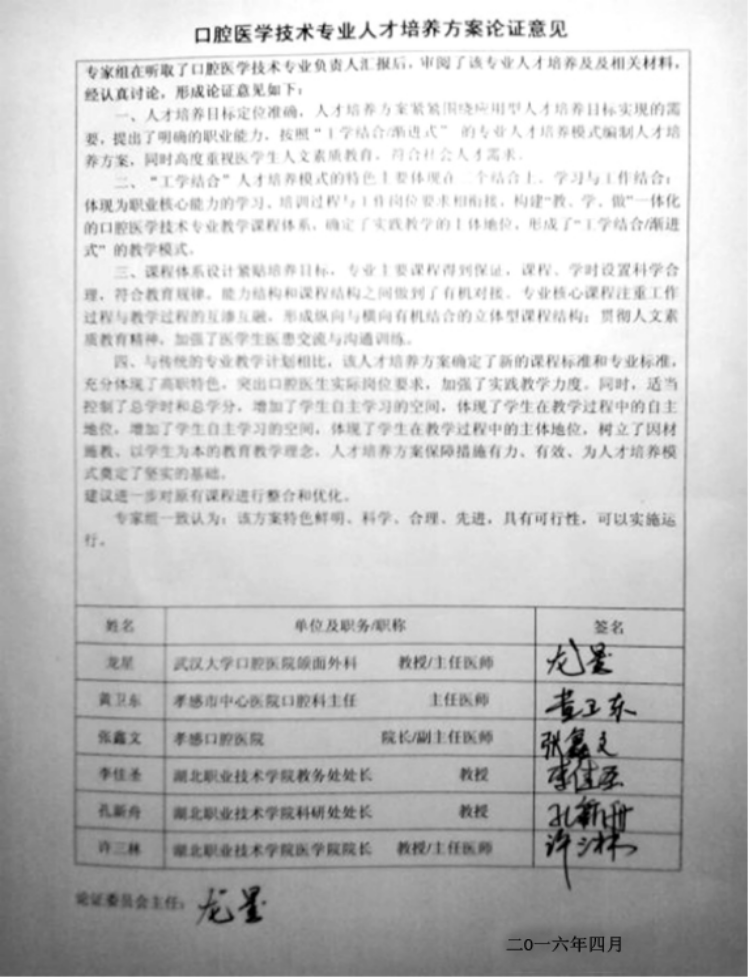 人才培养方案是根据专业人才培养目标和培养规格所制定的实施人才培养活动的具体方案,是对专业人才培养的逻辑起点、培养目标与规格、内容与方法、条件与保障等培养过程及方式的描述和设计。本专业人才培养方案以党的十八大及十八届三中、四中、五中和习近平总书记系列重要讲话精神为指导,以“创新、协调、绿色、开放、共享”的发展理念为指引,深入贯彻《国务院关于加快发展现代职业教育的决定》(国发【2014】19号)、《教育部关于深化职业教育教学改革全面提高人才培养质量的若干意见》(教职成【2015】6号)、《高等职业学校专业教学标准》等文件精神,根据湖北职业技术学院《关于制定2016版人才培养方案的意见》要求,立足实际,结合近年来口腔医学行业及用人单位对专业人才培养规格的新要求,成立了人才培养方案修订工作专班,聘请行业专家共同开展专业人才需求与培养规格调研,依据行业标准和用人单位要求,制定了2016版口腔医学专业人才培养方案,新的人才培养方案修订过程中,坚持以综合职业能力培养为核心,开展职业能力分析,明确专业人才培养目标;以立德树人为根本,突出职业道德、职业素养、职业精神的培养,促进学生全面发展,增强学生可持续发展能力。修订后形成的《口腔医学专业人才培养方案》(2016版)与(2010版)人才培养方案相比,培养目标与人才规格注重契合行业和地方特色,具有较高的实用性和前瞻性; 课程设置突出职业教育特点和口腔专业特色,课程体系突出综合性和实践性;在学时分配上,从提高教学质量和效益出发,充分发挥学生学习主动性与创造性。本专业人才培养方案制定完成后,广泛征求意见,组织了包括行业专家在内的专家组评议和论证,以期能取得较好的人才培养质量,为区域经济和社会发展作出应有的贡献。
