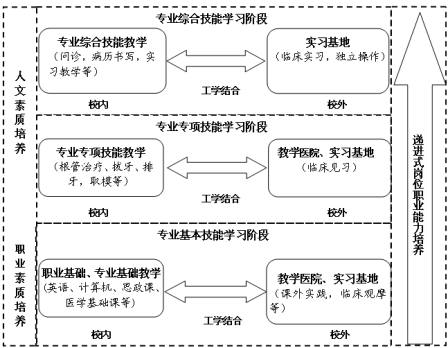 依照学院"专业与职业一体,学业与岗位融通"为特质的人才培养模式,我们进一步完善和改进了原来的人才培养模式,创新 “三阶段、两融通、一递进”的工学结合人才培养模式。该人才培养模式基于职业发展导向,以真实的工作环境或模拟真实的实训基地为主要的学习场所,学生早接触临床、反复接触、接触真实的病人,使课堂理论知识与临床实践紧密融合,让学生在真实的工作环境中学习,实现课堂教学与实际工作环境的统一,可以提高学生的学习兴趣,有利于学生职业素养的养成,为学生毕业后迅速适应工作岗位打下坚实的基础。
