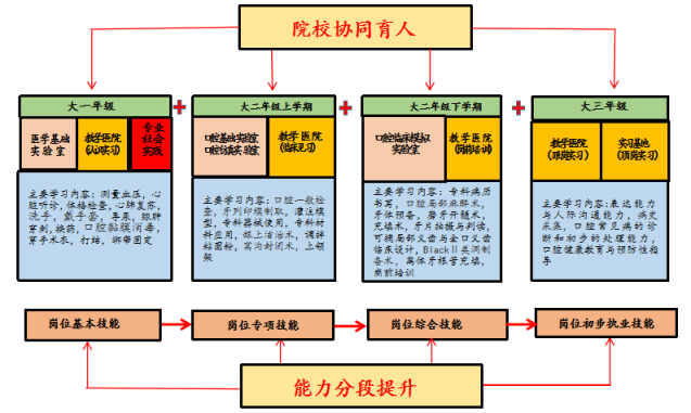 1、创新人才培养模式:根据口腔医学专业的人才培养现状和社会对人才要求,完成了口腔医学专业调研分析总结,结合国家口腔职业助理医师考试大纲要求,明确了口腔医学专业的人才培养目标。针对人才培养目标,创新实施了“院校协同育人,能力分段提升”人才培养模式,该模式以培养学生岗位工作中所需要的知识、能力、职业素质为目标,以真实的工作环境(医院)或模拟真实的实训基地(学校)为教学环境,以校内专任教师和医院兼职教师共同实施教学,使课堂理论知识与临床实践紧密融合;大学三年的学习过程,学生通过岗位基本技能、岗位专项技能、岗位综合技能的训练,获得初步的岗位执业能力;整个学习过程,贯穿人文素质教育与创业创新教育,充分利用校内教学资源和行业实践教学资源,以培养学生岗位胜任能力。