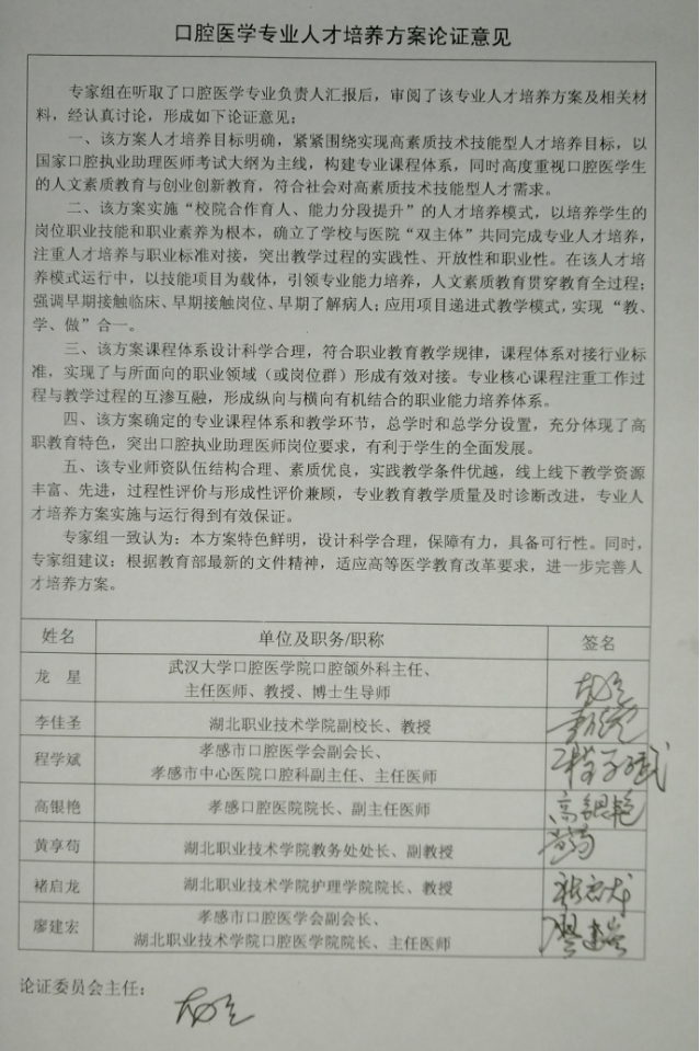 经过多年的建设和发展,口腔医学院拥有一支业务过硬,结构合理的专兼结合的“双师”素质教师队伍。现有专业教师104人,其中专任教师56人;另有兼职教师46人,楚天技能名师1人。专任教师中高级职称15名,占57.7%;专任教师中研究生学历或硕士12人,占专任教师50.0% ,“双师型”教师36名,占66.7%。聘任了1名具有行业影响力的专家武汉大学口腔医院龙星教授作为楚天技能名师,进一步优化了教师队伍结构。